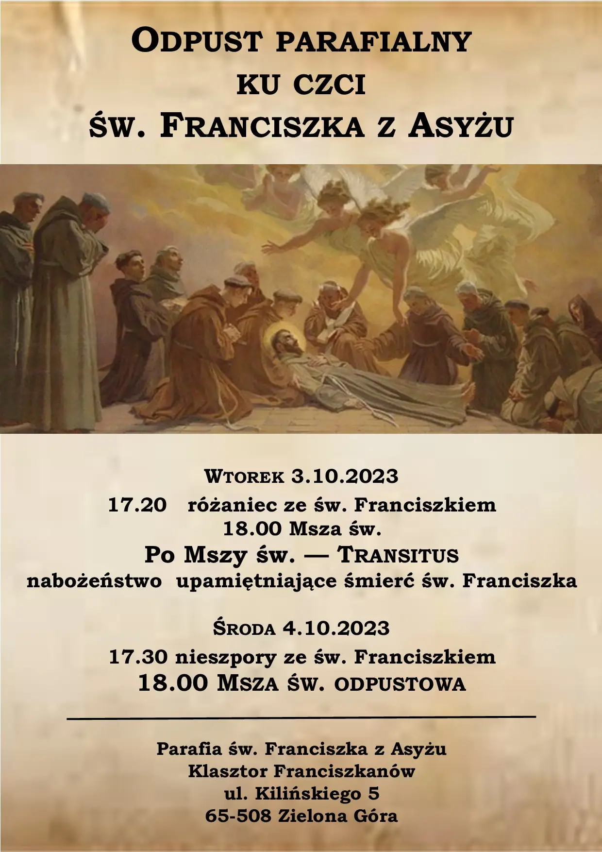 Każda wspólnota parafialna przeżywa w ciągu roku święto swojego patrona. Dla naszej wspólnoty parafialnej tym szczególnym dniem jest 4 października, kiedy to w liturgii wspominamy św. Franciszka z Asyżu. Święto patronalne nazywane jest odpustem i jest to bardzo ważny dzień dla całej wspólnoty parafialnej, która w tym dniu dziękuje swojemu opiekunowi za orędownictwo, pomoc i opiekę.
