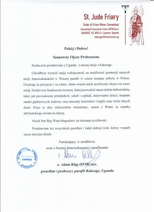 Podziękowanie O. Adama za przyjęcie i ofiary na rzecz misji