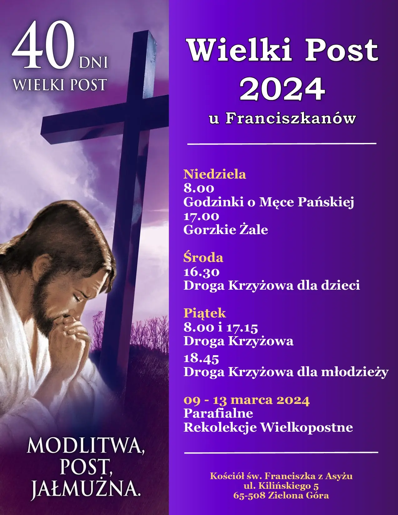 - udział w organizowanych nabożeństwach Drogi Krzyżowej (odprawianych w piątki) oraz w Gorzkich Żalach (odprawianych w niedziele);